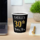 This luxurious and fancy birthday paper cup design features a personalized name and the message “30th Birthday Party”. The large number “30th” has an imitation/faux gold-inspired coloring pattern, the words “Birthday Party” are in elegant script-style text, and the background is colored black by default (although it can be customized). Elegant, opulent paper cups like this might be used at a birthday celebration being held to honor somebody’s thirtieth birthday. [~Z0000567]