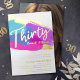 Bold abstract art brush strokes in bright pink, purple and blue with gold foil or your own foil color photo template 30th birthday party invitation. Personalize this thirty script art milestone birthday invitation with your own birthday party event details, and a photos of your birthday girl on the reverse. Other years colors and matching items are available. © Original design by Sarah Trett for www.mylittleeden.com on Zazzle.