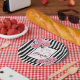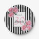 A napkin for a 30th birthday party. Classic slim black and white vertical stripes as background. With girly and feminine pink roses as decoration.