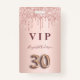 A modern, stylish and glamorous badge for a 30th birthday party. A faux rose gold metallic looking background with an elegant faux rose gold glitter drip, paint drip look. The name is written with a modern dark rose gold colored hand lettered style script. With the text: VIP Number 30 is written with a balloon style font, script.