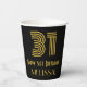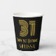 This vintage appearance and 1920s-1930s style inspired birthday themed paper cup design features a large art deco inspired appearance number “31”, plus the birthday greeting message “Happy 31st Birthday,” and a custom name. The background is colored black. 1920s-1930s style inspired birthday themed paper cups like this might be used at a party for somebody who is celebrating their thirty first birthday. [~Z0000546]