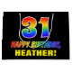This colorful, fun, and cheerful birthday-themed gift bag design features a large number "31" and the message "HAPPY BIRTHDAY,", both colored with a rainbow spectrum gradient inspired pattern, along with a bold yellow customizable recipient name. The background is colored black. A fun gift bag like this might be used when wrapping gifts being given to somebody in celebration of their 31st birthday. [~Z0000477]