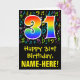 The front of this fun, vibrant, and colorful birthday-themed greeting card design features a large number "31" having a rainbow spectrum gradient inspired pattern. It also features the message "Happy 31st Birthday,", and an editable recipient name. The front also features a pattern of various music notes and symbols having a variety of colors and sizes. The inside features a custom birthday greeting message, or could perhaps be cleared and left blank if a message is to be written by hand instead. A custom birthday card like this might be a fun way to send birthday wishes to a musician, singer, composer, or somebody else who is celebrating their thirty first birthday. [~Z0000420]