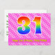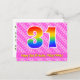 The front of this cheerful, upbeat, and fun birthday themed postcard design features a large number "31" with a rainbow spectrum gradient inspired pattern, along with the message "Happy 31st Birthday,", and a customizable recipient name. The front additionally features a happy dark pink and light pink striped pattern with heart shapes. The back features a custom birthday greeting message, or could perhaps be cleared and left blank if a message is to be written by hand instead. A customizable birthday postcard like this might be a fun way to send a message in celebration of somebody’s thirty first birthday. Postcards like this might also be used to invite guests to a birthday party being held for somebody who is turning 31 years old. [~Z0000449]