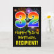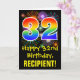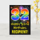 The front of this fun, colorful, and exciting birthday greeting card design features a large number "32" having a rainbow spectrum gradient inspired pattern. It also features the message "Happy 32nd Birthday,", and an editable recipient name. The front additionally has a colorful bursting celebratory fireworks inspired background pattern. The inside features a customizable birthday greeting message, or could perhaps be cleared and left blank if a message is to be written by hand instead. A customizable birthday card like this might be a fun way to send a message in celebration of somebody’s thirty-second birthday. [~Z0000442]