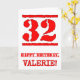 This fun birthday-themed greeting card design features a large red number “32” having a rubber stamp inspired look, in addition to the birthday greeting message “HAPPY BIRTHDAY,” and a personalized name on the front. The inside has a custom birthday greeting message, or could perhaps be cleared and left blank if a message is to be written by hand instead. A fun customizable birthday greeting card like this might be a fun way to deliver birthday greetings to somebody who is celebrating their thirty-second birthday. [~Z0000524]