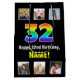 This cheerful and bold birthday-themed gift bag design features a large number “32“ having a vibrant multicolored rainbow spectrum inspired gradient pattern, plus the message “Happy 32nd Birthday,“ and a personalized recipient name. The photos above and below the message can be personalized, perhaps with photos of the recipient, the recipient’s family and friends, and/or the sender(s) of the gift. A fun birthday themed giftbag like this might be used when giving a gift or present in celebration of somebody’s thirty-second birthday. (Photography © Storytree Studios, Stanford, CA.) [~Z0000669]