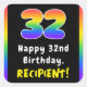 This cheerful and joyful birthday-themed square sticker design features the number “32“ having a vibrant multicolored rainbow spectrum inspired gradient pattern, along with the message “Happy 32nd Birthday,”, and an editable recipient name. Stickers like these might be distributed or used at a birthday party held for somebody who is celebrating their 32nd birthday, or perhaps used when preparing invitations or wrapping gifts for such an event. [~Z0000630]