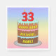 This cheerful and fun birthday themed paper napkin design features a cartoon-style depiction of a three-tier birthday cake having numeral-shaped candles on top showing the number “33“, along with the message “HAPPY 33RD BIRTHDAY,”, and a personalized recipient name. The background has a multicolored pastel rainbow spectrum inspired gradient pattern. Paper napkins like these might be used at a birthday party for somebody who is celebrating their 33rd birthday. [~Z0000623]