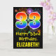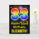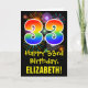 The front of this fun, colorful, and exciting birthday-themed greeting card design features a large number "33" with a rainbow spectrum gradient inspired pattern, along with the message "Happy 33rd Birthday,", and a custom recipient name. The front additionally features a colorful background pattern inspired by the look of bursting celebratory fireworks. The inside features a personalized birthday greeting message, or could perhaps be cleared and left blank if a message is to be written by hand instead. A personalized birthday card like this might be a fun way to celebrate somebody’s thirty third birthday. [~Z0000442]