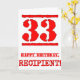 This fun birthday-themed greeting card design features a large red number “33” having a rubber stamp inspired look, in addition to the birthday greeting message “HAPPY BIRTHDAY,” and a custom name on the front. The inside has a customized birthday greeting message, or could perhaps be cleared and left blank if a message is to be written by hand instead. A fun editable birthday greeting card like this might be a fun way to send birthday greetings to somebody who is celebrating their thirty-third birthday. [~Z0000524]
