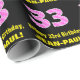 This fun and joyful birthday-themed wrapping paper design features a large number "33" with a dark pink and light pink striped pattern containing heart shapes. It also features the birthday greeting message "Happy 33rd Birthday,", and a customizable recipient name. Birthday themed wrapping paper like this might be a fun way to wrap a gift or present being given to celebrate somebody’s 33rd birthday. It might also be a fun choice for somebody whose birthday falls on February 14th (Valentine's Day), due to its loving heart symbols and colors. [~Z0000435]