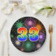 This fun, cheerful, and colorful paper plate design features a large number "33" colored with a rainbow spectrum gradient inspired pattern. It also features a exciting and vibrant bursting celebratory fireworks inspired pattern. It has a black colored background. Paper plates like this might be fun to use at a party being held to celebrate somebody’s 33rd birthday, a thirty third anniversary, or some other thirty third event. [~Z0000490]