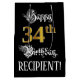 This fancy and opulent birthday gift bag design features the message “Happy 34th Birthday,”, and a custom recipient name. Part of the message is in a luxurious script-style text. The large number “34th” features a faux/imitation gold-inspired look pattern. The background is colored black. An ornate gift bag like this might be a respectable way of wrapping a birthday present or gift being given to somebody who is celebrating their thirty fourth birthday. [~Z0000560]