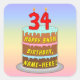 This joyful and colorful birthday-themed square sticker design features a cartoon-style depiction of a three-tier birthday cake having numeral-shaped candles on top showing the number “34“, along with the message “HAPPY 34TH BIRTHDAY,”, and a custom recipient name. The background features a multi-color pastel rainbow spectrum inspired gradient pattern. Fun birthday themed stickers like these might be given out or used at a birthday party in celebration of somebody’s 34th birthday, or perhaps used when preparing invitations or wrapping gifts/presents for such an event. [~Z0000624]