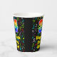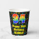 This fun and exciting music-themed birthday paper cup design features a large number “34” with a rainbow spectrum gradient inspired pattern, along with the message “Happy 34th Birthday,”, and a customizable name. The background features a colorful pattern having music notes and symbols of various sizes and colors. Colorful, vibrant paper cups like this might be fun to use at a birthday party being held to honor somebody’s thirty fourth birthday. [~Z0000541]