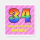 This upbeat and festive 34th birthday-themed paper napkin design features a large number "34" having a colorful pattern inspired by the appearance of a rainbow spectrum. It also features the message "Happy 34th Birthday,", and a personalized name. The background features a cheerful pattern of light pink and dark pink stripes containing loving pink heart shapes. Birthday themed paper napkins like this might be used when celebrating somebody’s 34th birthday. [~Z0000417]