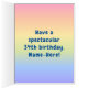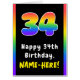 This exciting and eye-catching birthday-themed greeting card design features a big number “34“ with a multicolored rainbow spectrum inspired gradient pattern, along with the message “Happy 34th Birthday,”, and an editable recipient name. The inside has a customized birthday greeting message, or could perhaps be cleared and left blank if a message is to be written by hand instead. A fun, personalized birthday greeting card like this might be a fun way to deliver some birthday wishes to somebody who is celebrating their thirty-fourth birthday. [~Z0000628]