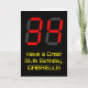 The front of this geeky and fun birthday-themed greeting card design features a large number "34" having a red seven segment digital display style appearance, along with the message "Have a Great 34th Birthday," and an editable name, on a black colored background. The inside features a personalized birthday greeting message, or could perhaps be cleared and left blank if a message is to be written by hand instead. A customizable birthday card like this might be a fun way to acknowledge somebody’s thirty fourth birthday. [~Z0000386]