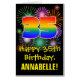 The front of this fun, exciting, and vibrant birthday greeting card design features a large number “35” with a rainbow spectrum gradient inspired pattern, along with the message “Happy 35th Birthday,”, and a customizable recipient name. The front additionally has a multicolored bursting celebratory fireworks inspired background pattern. The inside features a customizable birthday greeting message, or could perhaps be cleared and left blank if a message is to be written by hand instead. A customizable birthday card like this might be a fun way to acknowledge somebody’s thirty fifth birthday. [~Z0000526]