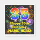 This cheerful and joyful birthday-themed paper napkin design features a large number “35” with a colorful rainbow spectrum gradient inspired pattern, along with the message “Happy 35th Birthday,”, and a custom name. The background features a multicolored pattern inspired by the look of bursting celebratory fireworks. Paper napkins like this might be used at a party held in celebration of somebody’s thirty fifth birthday. [~Z0000574]