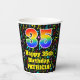 This fun and exciting music themed birthday paper cup design features a large number “35” with a rainbow spectrum gradient inspired pattern, along with the message “Happy 35th Birthday,”, and an editable name. The background features a colorful pattern having music notes and symbols of various colors and sizes. Vibrant, colorful paper cups like this might be fun to use at a birthday party being held in celebration of somebody’s thirty fifth birthday. [~Z0000541]