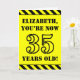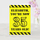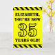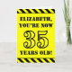 The front of this fun and attention-grabbing birthday-themed greeting card design features a customizable name and the message "YOU’RE NOW 35 YEARS OLD!" in black stencil inspired text on a yellow colored background. There is also an eye-catching yellow and black striped pattern at the top and bottom edges of the front. The inside features a customized birthday greeting message, or could perhaps be cleared and left blank if a message is to be written by hand instead. A customizable birthday card like this might be a fun way to acknowledge somebody’s thirty fifth birthday. [~Z0000413]
