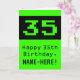 This fun and nerdy birthday-themed greeting card design features a large green retro computer gaming style number "35" on the front. It also features the birthday greeting message "Happy 35th Birthday,", and a name that can be personalized. The inside features a customizable birthday greeting message, or could perhaps be cleared and left blank if a message is to be written by hand instead. A silly birthday greeting card like this might be used to send a birthday greeting message in honor of the thirty fifth birthday of a computer programmer, a computer system administrator, or somebody who appreciates retro video games. [~Z0000430]