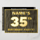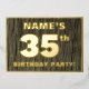The front of this bold thirty-fifth birthday party/celebration foil invitation card features a custom name, a large number “35th”, the message “BIRTHDAY PARTY!”, and a border, all in foil. There is a rustic, yet elegant, faux wood grain look inspired pattern for the background of the front. The back features personalized details about the event, such as the date, time, venue/place, and any other information that may be useful. Personalized invitations like these might be used to invite guests/attendees to a birthday party being held to honor somebody’s 35th birthday. [~Z0000598]