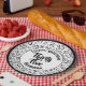 This numeric design is a black and white random number pattern with milestone number 35 repeated in varied sizes and angles. Your text is printed in the white circle in the center. The design is trimmed with white and black rings around the rim.