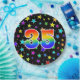 This fun, cheerful, and colorful paper plate design features a large number "35" colored with a rainbow spectrum gradient inspired pattern. The background features a colorful star shapes pattern. Fun paper plates like this might be used at somebody’s thirty fifth birthday party, or a couple’s thirty fifth anniversary celebration, or some other 35th event. [~Z0000493]