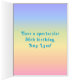 This joyful and upbeat birthday themed greeting card design features a cartoon-style depiction of a three-tier birthday cake having number-shaped candles on top showing the age “36“, along with the message “HAPPY 36TH BIRTHDAY,”, and an editable recipient name. The background of the front has a multicolored pastel rainbow spectrum inspired gradient pattern. The inside features a customized birthday greeting message, or could perhaps be cleared and left blank if a message is to be written by hand instead. A cheerful, personalized birthday greeting card like this might be a fun way to deliver birthday greetings to somebody who is celebrating their thirty-sixth birthday. [~Z0000626]
