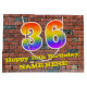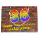 This fun and colorful birthday gift bag design, inspired by urban art and graffiti, features a large number "36" with a rainbow spectrum gradient inspired pattern, along with the message "Happy 36th Birthday,", and a custom name. The background features a brick wall style pattern. A gift bag like this might be a fun way of wrapping a birthday present or gift being given to somebody who is celebrating their thirty sixth birthday. [~Z0000522]