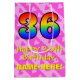 This cheerful, fun, and loving birthday-themed giftbag design features a large number "36" with a rainbow spectrum gradient style pattern, along with the message "Happy 36th Birthday,", and a custom recipient name. It also has an upbeat background featuring pink-colored heart shapes within a stripes pattern. A happy giftbag like this might be used when wrapping presents being given to somebody in celebration of their 36th birthday. [~Z0000511]