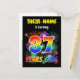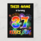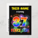 The front of this lively and fun birthday party invitation postcard design has a customizable name, a vibrant bursting celebratory fireworks inspired pattern, and the message "37 YEARS OLD!" having a colorful rainbow spectrum inspired gradient pattern. The back features a customizable message that could describe when and where the party is being held, in addition to other relevant information. Invitation postcards like this could be sent to potential attendees of a birthday party being held in celebration of somebody’s thirty seventh birthday. [~Z0000452]