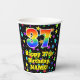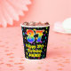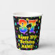 This fun and colorful birthday paper cup design features a large number “37” with a rainbow spectrum gradient inspired pattern, along with the message “Happy 37th Birthday,”, and a personalized name. The background features an exciting and colorful pattern featuring many star shapes with different colors and sizes. Colorful, vibrant paper cups like this might be fun to use at a birthday celebration/party being held in celebration of somebody’s thirty seventh birthday. [~Z0000540]