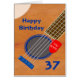 37th Birthday card for someone who loves the guitar. A close-up of a guitar with a plectrum tucked into the strings. On the plectrum are the words 'You Rock'. A birthday card for a musician who loves the guitar.