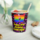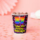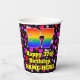 This fun and happy birthday themed paper cup design features a large number “37” with a rainbow spectrum gradient inspired pattern, along with the message “Happy 37th Birthday,”, and an editable name. The background features a pattern of purple, red, and pink heart shapes of various sizes. Upbeat, loving paper cups like this might be fun to use at a birthday celebration being held to honor somebody’s 37th birthday. [~Z0000548]