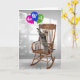 Playful tabby cat standing on a wooden rocking chair and reaching for a colorful balloon bouquet for 38th birthday.