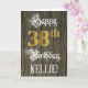 The front of this fancy and luxurious birthday-themed greeting card design features the message “Happy 38th Birthday,”, and a custom recipient name. Some of the message is in formal script-style text. The large number “38th” features an imitation/faux gold-inspired look pattern. The background has a faux/imitation woodgrain-inspired pattern. The inside has an editable birthday greeting message, or could perhaps be cleared and left blank if a message is to be written by hand instead. An elaborate, personalized birthday greeting card like this might be sent to celebrate somebody’s thirty-eighth birthday. [~Z0000561]