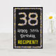 The front of this fun, garden-inspired birthday themed greeting card design features the message “Happy 38th Birthday,” along with a personalized recipient name. The large number “38” plus the border on the front feature flower icons. The inside has a customizable birthday greeting message, or could perhaps be cleared and left blank if a message is to be written by hand instead. A floral, personalized birthday greeting card like this might be used to celebrate somebody’s thirty-eighth birthday. [~Z0000648]
