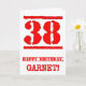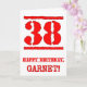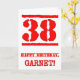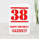 This fun birthday-themed greeting card design features a large red number “38” having a rubber stamp inspired look, along with the birthday greeting message “HAPPY BIRTHDAY,” and a custom name on the front. The inside has an editable birthday greeting message, or could perhaps be cleared and left blank if a message is to be written by hand instead. A fun customizable birthday greeting card like this might be used to celebrate somebody’s thirty-eighth birthday. [~Z0000524]