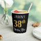 This opulent and fancy birthday paper cup design features a custom name and the message “38th Birthday Party”. The large number “38th” has an imitation/faux gold-inspired coloring pattern, and the words “Birthday Party” are in ornate script-style text. The background is colored black by default (although it can be customized). Ornate, elegant paper cups like this might be useful at a birthday celebration/party being held to honor somebody’s thirty eighth birthday. [~Z0000567]