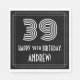 This 1920s/1930s style inspired birthday paper napkin design features a large Art Deco style inspired number "39", the message "HAPPY 39th BIRTHDAY,", a custom name, and a border pattern consisting of lines. Fun, personalized birthday themed paper napkins like this might be used at somebody’s 39th birthday celebration. [~Z0000395]
