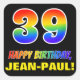 This cheerful, colorful, and fun birthday-themed sticker design features a large number "39" and the message "HAPPY BIRTHDAY,", both having a rainbow spectrum gradient inspired pattern coloring, along with a bold yellow custom name. The background is colored black. Fun birthday themed stickers like this may be used when wrapping a gift or present being given to celebrate somebody’s thirty ninth birthday, or perhaps might be given out to the attendees at a birthday party or celebration. [~Z0000480]