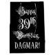This elaborate and fancy birthday themed giftbag design features the message “Happy 39th Birthday,” in formal script style text, on a black colored background. It also has a personalized recipient name. An opulent birthday themed gift bag like this might be a respectable way to wrap a gift or present being given to celebrate somebody’s thirty ninth birthday. [~Z0000557]