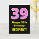39th Birthday: Pink Stripes and Hearts "39" + Name Card