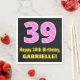 This joyful and fun birthday themed paper napkin design features a large number "39" having a striped pattern containing heart shapes colored light pink and dark pink. It also features the birthday greeting message "Happy 39th Birthday,", and a custom name. Paper napkins like this might be nice to have at a party being held to celebrate somebody’s thirty ninth birthday. It might also be a fun choice for somebody who has a birthday that falls on Valentine's Day (February 14), due to its loving heart symbols and colors. [~Z0000436]