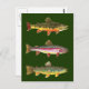 THREE TROUT - Brook Trout, salvelinus fontinalis; Rainbow Trout, oncorhynchus mykiss; and, Brown Trout, salmo trutta. From three original watercolor paintings by Doug Shultz. If you love fishing, you'll love this one-of-a-kind postcard and perfect for your another angler anytime. This same design available on hundreds of other products.