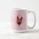 Enjoy your beverage of choice in this mug sporting three smiling Shepherd faces resting on a red diamond background.